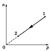 12 | При переводе идеального газа из состояния 1 в состояние 2 концентрация молекул n пропорциональна давлению p (см. рисунок). Масса газа в процессе остаётся постоянной.