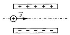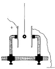 17 | Для оценки заряда, накопленного воздушным конденсатором, можно использовать устройство, изображённое на рисунке: лёгкий шарик из оловянной фольги подвешен на изолирующей нити между двумя пластинами конденсатора, при этом одна из пластин заземлена, а другая заряжена положительно. Когда устройство собрано, а конденсатор заряжен (и отсоединён от источника), шарик приходит в колебательное движение, касаясь поочерёдно обеих пластин.