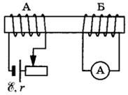 24 | На железном стержне намотаны две катушки изолированного медного провода А и Б. Катушка А подключена к источнику с ЭДС E и внутренним сопротивлением r, как показано на рисунке. Катушка Б замкнута на амперметр малого сопротивления. Ползунок реостата передвигают влево. В каком направлении протекает при этом ток через амперметр, подключённый к катушке Б? Ответ обоснуйте, указав, какие явления и закономерности Вы использовали для объяснения.