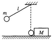 30 | Маленький шарик массой m = 0,25 кг подвешен на лёгкой нерастяжимой нити длиной l = 0,8 м, которая разрывается при некоторой силе натяжения Шарик отведён от положения равновесия (оно показано на рисунке пунктиром) и отпущен. Когда шарик проходит положение равновесия, нить обрывается, и шарик тут же абсолютно неупруго сталкивается с бруском массой M = 2,75 кг, лежащим неподвижно на гладкой горизонтальной поверхности стола. Скорость бруска после удара u = 0,4 м/с. Определите величину силы T0. Считать, что брусок после удара движется поступательно.