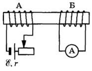 24 | На железном стержне намотаны две катушки изолированного медного провода А и Б. Катушка А подключена к источнику с ЭДС E и внутренним сопротивлением r, как показано на рисунке. Катушка Б замкнута на амперметр малого сопротивления. Ползунок реостата передвигают влево. В каком направлении протекает при этом ток через амперметр, подключённый к катушке Б? Ответ обоснуйте, указав, какие явления и закономерности Вы использовали для объяснения.