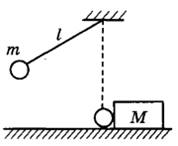 30 | Маленький шарик массой m = 0,5 кг подвешен на лёгкой нерастяжимой нити длиной l = 0,8 м, которая разрывается при силе натяжения T0 = 8,6 Н. Шарик отведён от положения равновесия (оно показано на рисунке пунктиром) и отпущен. Когда шарик проходит положение равновесия, нить обрывается, и шарик тут же абсолютно неупруго сталкивается с бруском, лежащим неподвижно на гладкой горизонтальной поверхности стола. Скорость бруска после удара u = 0,4 м/с. Какова масса M бруска? Считать, что брусок после удара движется поступательно.