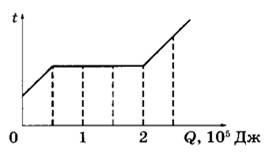 11 | Вещество массой 6 кг находится в сосуде. На рисунке показан график изменения температуры t вещества по мере поглощения им количества теплоты Q. Первоначально вещество было в твёрдом состоянии. Какова удельная теплота плавления вещества?
