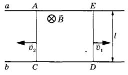 28 | На горизонтальном столе лежат два параллельных друг другу рельса: a и b, — замкнутых двумя одинаковыми металлическими проводниками: АС и ED (см. рисунок). Вся система проводников находится в однородном магнитном поле, направленном вертикально вниз. Модуль индукции магнитного поля равен B, расстояние между рельсами l, скорости проводников v1 и v2. Чему равно сопротивление каждого из проводников, если сила тока в цепи равна I? Сопротивлением рельсов пренебречь.