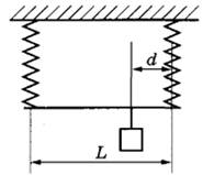 30 | К двум вертикально расположенным пружинам одинаковой длины подвесили однородный стержень массой М = 2 кг и длиной L = 40 см. Если к этому стержню подвесить груз на расстоянии d = 5 см от правой пружины, то стержень будет расположен горизонтально, а растяжения обеих пружин будут одинаковы (см. рисунок). Жёсткость левой пружины в 3 раза меньше, чем у правой. Чему равна масса т подвешенного груза? Сделайте рисунок с указанием сил, использованных в решении задачи.