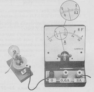22 | Определите силу тока в лампочке (см. рисунок), если погрешность прямого измерения силы тока равна цене деления амперметра.