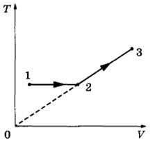 27 | Один моль одноатомного идеального газа совершает процесс 1-2-3, график которого показан на рисунке в координатах T-V, Известно, что в процессе 1-2 газ совершил работу 3 кДж, а в процессе 2-3 объём газа V увеличился в 2 раза. Какое количество теплоты было сообщено газу в процессе 1-2-3, если его температура Т в состоянии 3 равна 600 К?