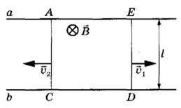 28 | На горизонтальном столе лежат два параллельных друг другу рельса: a и b, замкнутых двумя одинаковыми металлическими проводниками: АС и ED (см. рисунок). Вся система проводников находится в однородном магнитном поле, направленном вертикально вниз. Модуль индукции магнитного поля равен B, расстояние между рельсами l, скорости проводников v1 и v2, сопротивление каждого из проводников R. Какова сила тока в цепи? Сопротивлением рельсов пренебречь.