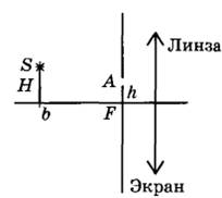 29 | Главная оптическая ось тонкой собирающей линзы с оптической силой D = 5 дптр и точечный источник света S находятся в плоскости рисунка. Точка S находится на расстоянии b = 70 см от плоскости линзы и на расстоянии H = 10 см от её главной оптической оси. В левой фокальной плоскости линзы лежит тонкий непрозрачный экран с маленьким отверстием A, находящимся в плоскости рисунка на расстоянии h от главной оптической оси линзы. Определите расстояние h, если известно, что луч SA от точечного источника, пройдя через отверстие в экране и линзу, пересечёт её главную оптическую ось на расстоянии x = 18 см от плоскости линзы? Дифракцией света пренебречь. Постройте рисунок, показывающий ход луча через линзу.