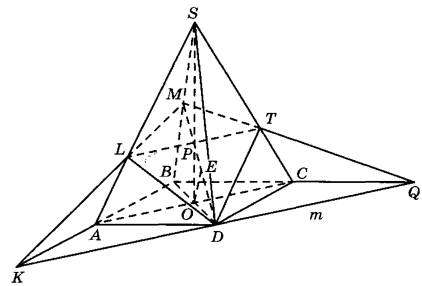 Обозначим точки пересечения прямой m с прямыми АВ и ВС соответственно K и Q. Пусть прямая KM пересекает ребро SA в точке L, а прямая МО пересекает ребро SC в точке Т. Четырёхугольник DLMT — искомое сечение.