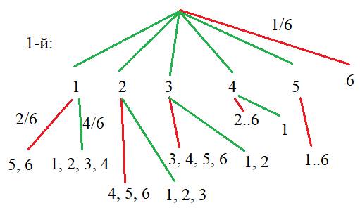 Построим дерево решений при двух бросках, пока число очков не превысило в сумме 5: