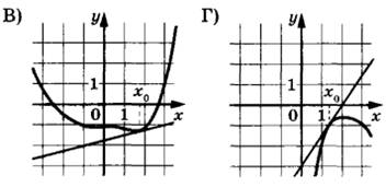 Задание 7. На рисунках изображены графики функций и касательные, проведённые к ним в точках с абсциссой х0. Установите соответствие между графиками функций и значениями производной этих функций в точке х0.