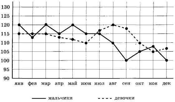7 | На рисунке точками изображено число родившихся мальчиков и девочек (по отдельности) за каждый календарный месяц 2013 года в городском роддоме. По горизонтали указываются месяцы, по вертикали — число рождений. Для наглядности точки соединены линиями.
