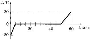 10 | Килограммовый кусок льда внесли с мороза в тёплое помещение. Зависимость температуры льда от времени представлена на рисунке. Какое количество теплоты было получено в интервале времени от 50 мин до 60 мин?