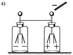 11 | Два незаряженных электроскопа соединены проволокой. К одному из электроскопов подносят, не касаясь, отрицательно заряженную палочку. При этом листочки обоих электроскопов расходятся. Правильное перераспределение зарядов на листочках электроскопов показано на рисунке