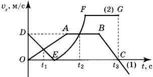 1) Момент времени t2 соответствует встрече двух тел. 2) Участок EF соответствует ускоренному движению тела (2). 3) Участок AB соответствует состоянию покоя тела (1). 4) Момент времени t3 соответствует остановке тела (1). 5) К моменту времени t1 тела прошли одинаковые пути.