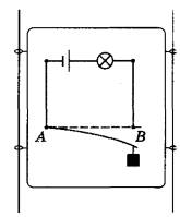 24 | На вертикально расположенной доске закреплена электрическая схема (см. рисунок), состоящая из источника тока, лампы, упругой стальной пластины АВ. К одному концу пластины подвесили гирю, из-за чего пластина изогнулась и разомкнула цепь. Что будет наблюдаться в электрической цепи, когда доска начнёт свободно падать? Ответ поясните.
