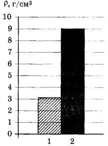 5 | На рисунке приведена столбчатая диаграмма. На ней представлены значения плотности веществ, из которых изготовлены два тела (1 и 2) одинакового объёма. Сравните их массы m1 и m2.