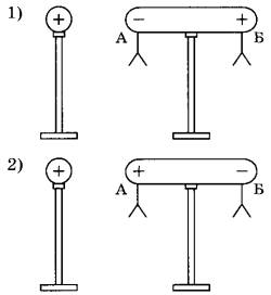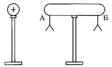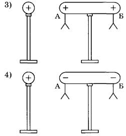 11 | К незаряженному изолированному проводнику АБ приблизили изолированный положительно заряженный металлический шар. В результате листочки, подвешенные с двух сторон проводника АБ, разошлись на некоторый угол (см. рисунок).