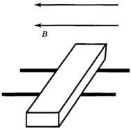 26 | В горизонтальном однородном магнитном поле на горизонтальных проводящих рельсах перпендикулярно линиям магнитной индукции расположен горизонтальный проводник массой 4 г (см. рисунок). Через проводник пропускают электрический ток. при силе тока в 10 А вес проводника становится равным нулю. Чему равно расстояние между рельсами? Модуль вектора магнитной индукции равен 0,02 Тл.