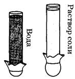 19 | В стеклянную трубку, нижнее отверстие которой закрыто тонкой резиновой плёнкой, наливают поочерёдно чистую воду и водный раствор соли (см. рисунок). В результате резиновое дно прогибается.