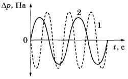 4 | На рисунке представлены графики изменения давления воздуха ∆p от времени t для звуковых волн, издаваемых двумя камертонами. Сравните амплитуду изменения давления и высоту тона волн.
