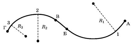 6 | Тело движется по криволинейной траектории (см. рисунок), причём на участке АБ его скорость неизменна по модулю и равна 2 м/с, а на участке ВГ равна 4 м/с. Для радиусов кривизны траектории в точках 1, 2 и 3 выполняется соотношение R1 > R2 > R3,