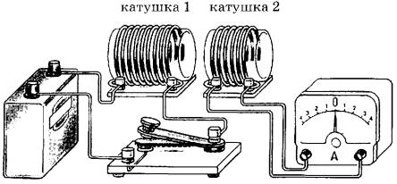 19 | Используя две катушки, одна из которых подсоединена к источнику тока, а другая замкнута на амперметр, ученик изучал явление электромагнитной индукции. На рисунке А представлена схема эксперимента, а на рисунке Б — показания амперметра для момента замыкания цепи с катушкой 1 (рис. 1), для установившегося постоянного тока, протекающего через катушку 1 (рис. 2), и для момента размыкания цепи с катушкой 1 (рис. 3).