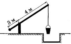 Задание 15. На рисунке изображён колодец с «журавлём». Короткое плечо имеет длину 3 м, а длинное плечо — 4 м. На сколько метров нужно поднять конец короткого плеча, чтобы конец длинного опустился на 2 м?