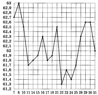 Так как по вертикали отложена цена, то по заданию нужно выбрать наименьшую отметку, соответствующую горизонтальному диапазону от 10 до 21. Из графика видно, что это цена 61,7 для 11-го дня.