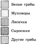 Задание 8. Какая из следующих круговых диаграмм показывает распределение грибов в лесу, если белых грибов всего 16%, мухоморов — 33%, лисичек — 14%, сыроежек — 26 % и других грибов — 11%?