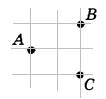 19 | На клетчатой бумаге с размером клетки 1x1 отмечены три точки: А, В и С. Найдите расстояние от точки А до середины отрезка ВС.