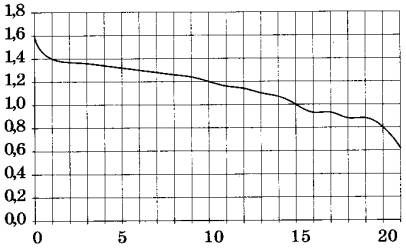 5 | При работе фонарика батарейка постепенно разряжается, и напряжение в электрической цепи фонарика падает. На рисунке показана зависимость напряжения в цепи от времени работы фонарика. На горизонтальной оси отмечается время работы фонарика в часах, на вертикальной оси — напряжение в вольтах. Определите по рисунку, за сколько часов напряжение упадёт с 1,2 вольта до 1 вольта.