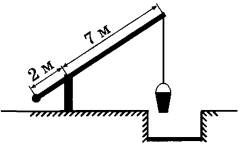 15 | На рисунке изображён колодец с «журавлём». Короткое плечо имеет длину 2 м, а длинное плечо — 7 м. На сколько метров опустится конец длинного плеча, когда конец короткого поднимется на 1 м?