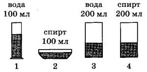 Задание 24. Для исследования процесса испарения жидкостей при комнатной температуре в различные сосуды цилиндрической формы, находящиеся в одном помещении при одинаковых условиях, налили спирт или воду различного объёма (см. рисунок). Далее измеряли время испарения жидкости из каждого сосуда.