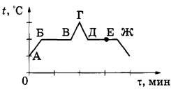 9 | На рисунке представлен график зависимости температуры t от времени τ при равномерном нагревании и последующем равномерном охлаждении вещества, первоначально находящегося в твёрдом состоянии.
