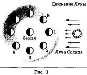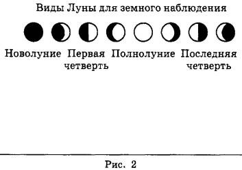 15 | На рис. 1 представлена схема движения Луны вокруг Земли, а на рис. 2 — изменение вида Луны для земного наблюдателя в течение лунного месяца.