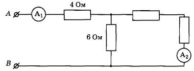 16 | Определите общее сопротивление цепи АВ, если первый амперметр показывает 3 А, а показания второго равны 1,5 А.