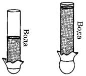 19 | В стеклянную трубку, нижнее отверстие которой закрыто тонкой резиновой плёнкой, по очереди наливают разные объёмы воды (см. рисунок). В результате резиновое дно прогибается.