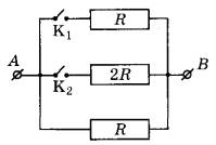 12 | На рисунке изображена схема электрической цепи, состоящей из трёх резисторов и двух ключей K1 и К2. Максимальное электрическое сопротивление участка АВ может быть получено