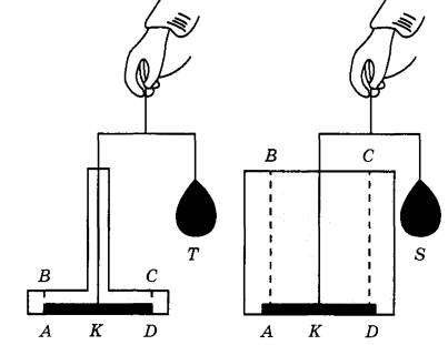 Рисунок 2. 1) Сила давления жидкости (рисунок 1) на дно сосуда (3) в два раза превышает силу давления жидкости на дно сосуда (4). 2) В опыте Стевина (рисунок 2) сила, прижимающая круг ко дну сосуда, зависит от атмосферного давления. 3) Повозка, построенная Стевином, приводилась в движение тепловым двигателем. 4) Противовесы Т и S уравновешивают вес столба воды ABCD, находящегося над кругом К.