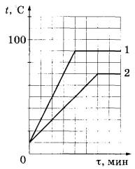 9 | Для исследования тепловых свойств двух жидкостей (1 и 2) их в равных массах (100 г) поместили в одинаковые сосуды и нагревали на одинаковых электрических плитках. Через определённые промежутки времени измеряли температуры жидкостей в сосудах. По результатам проведённых исследований были построены графики зависимости температуры жидкостей 1 и 2 от времени нагревания (см. рисунок).