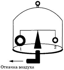 Если начать откачивать воздух из-под колпака (см. рисунок), то равновесие весов 1) не нарушится, так как массы шаров одинаковые 2) нарушится: перевесит шар 1 3) нарушится: перевесит шар 2 4) не нарушится, так как шары находятся в одной и той же среде