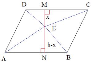 Проведем в параллелограмме ABCD высоту MN, равную h, и проходящую через точку E. Пусть расстояние ME=x, тогда NE=h-x. Площадь параллелограмма можно вычислить как