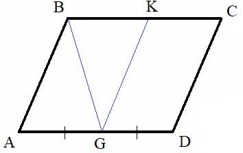 Сделаем построение, проведем GK, параллельную стороне AB. И, так как AD в 2 раза больше AB, а G – середина AD, то AB=AG и ABKG – ромб.