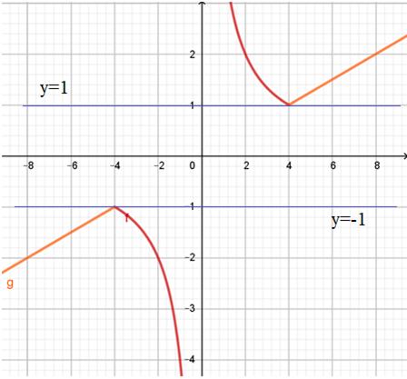 4. Прямая y=m имеет с графиком ровно одну общую точку при m = -1; 1. Эти значения можно вычислить, подставив в любую функцию граничные значения x=-4; 4: