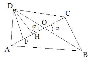 Задание 26. В четырёхугольнике ABCD диагонали пересекаются в точке О под углом α. Точка F принадлежит отрезку АС. Известно, что ВО = 19, DO = 16, АС = 24. Найдите AF, если площадь треугольника FCD в три раза меньше площади четырёхугольника ABCD.