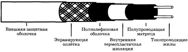 Саморегулирующий греющий кабель — разновидность нагревательных проводников, которые способны самостоятельно изменять выделение тепла в зависимости от температуры окружающей среды. Устройство саморегулирующего проводника представлено на рис. 1.