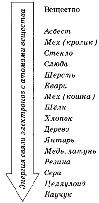 Знак избыточного заряда, который получают тела при трении, зависит от энергии связи электрона с атомами веществ, из которых изготовлены тела. Чем меньше энергия связи, тем легче вещество отдаёт свои _____. На диаграмме представлен ряд веществ в порядке возрастания (сверху вниз) _____ с атомами вещества. Согласно рассмотренной модели электризации, при трении палочки из стекла о кусок янтаря стекло получает _____ заряд, а янтарь получает _____ заряд. Список слов и словосочетаний 1) протоны 2) электроны 3) отрицательный 4) положительный 5) нейтральный 6) энергия связи электрона 7) взаимодействие излучения