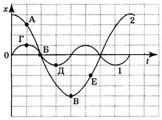 Из предложенного перечня утверждений выберите два правильных. Запишите в ответе их номера. 1) В положении, соответствующем точке Д на графике, маятник 1 имеет максимальную кинетическую энергию. 2) В положении, соответствующем точке Б на графике, оба маятника имеют максимальную скорость. 3) Оба маятника совершают затухающие колебания. 4) При перемещении маятника 2 из положения, соответствующего точке А, в положение, соответствующее точке Б, кинетическая энергия маятника возрастает. 5) Частоты колебаний маятников совпадают.